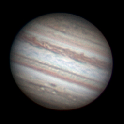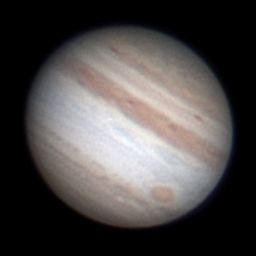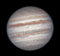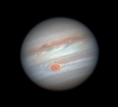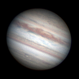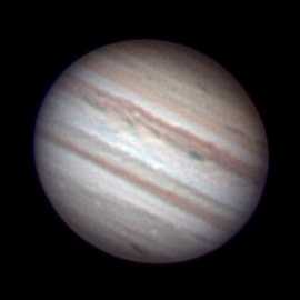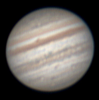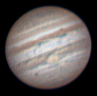 Notes: This is my best Jupiter image to date Telescope: Celestron CPC 800 (8") Barlow: Orion 2x Shorty Plus Camera: DMK 21AU04 with Orion RGB Filters Exposure: Stack of 442R @ 1/19s, 671G @ 1/30s, 622B @ 1/30s Pickering Seeing Rating: 6-7 Apparent Mag: -2.82 Distance: 4.0709 AU Date: 31st August 2009 Time: 11:53 am |