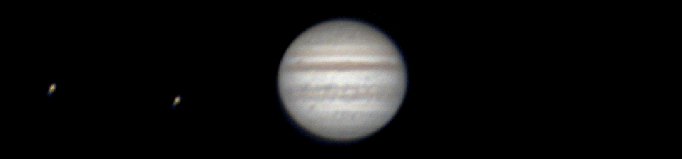 Eclipse in Ganymede Notes: One exposure every 3.33 minutes. 9 in total. Ganymede comes out of Jupiter's shadow while Io is visible on the right Telescope: Celestron CPC 800 (8") Barlow: Orion 2x Shorty Plus Camera: Celestron NexImage Each Exposure: Stack of 600-800 x 1/5 s @ 5 fps Date: July 10th June 2008 Time: 10:33 pm to 11:00 pm |