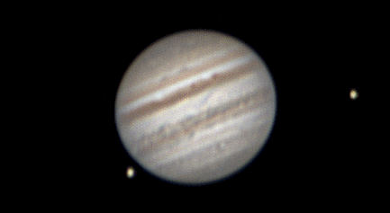 Notes: 3 frame animation of Europa, Ganymede coming out occultation, and Jupiter featuring Europa's shadow and GRS Telescope: Celestron CPC 800 (8") Barlow: Orion 2x Shorty Plus Camera: DMK 21AU04 with Orion RGB Filters Exposure: Stack of 400R @ 1/13s, 468G @ 1/23s, 557B @ 1/19s Pickering Seeing Rating: 4-5 Apparent Mag: -2.83 Distance: 4.0523 AU Date: 2nd August 2009 Time: 0:32, 0:37 & 0:44 am |