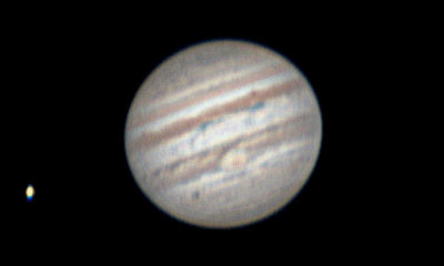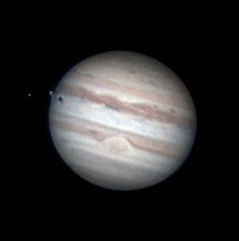 Note: Animation of 7 frames taken 10 to 15 minutes apart. The Moon is Europa Telescope: Celestron CPC 800 (8") Barlow: Orion 2x Shorty Plus Camera: DMK 21AU04 with Orion RGB Filters Exposure: Apparent Mag: -2.91 Distance: 3.9726 AU Date: 23th October 2011 Time: 12:54 am - 02:20 am |