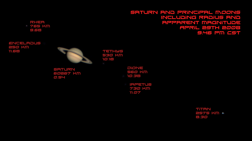 Note: One of my sharpest examples. Rhea can be seen, although Dione is barely visible at the bottom. Telescope: Celestron CPC 800 (8") Barlow: Orion 2x Shorty Plus Camera: Celestron NexImage Exposure: Stack of 800 x 1/5 s @ 5 fps Date: 30th May 2008 Time: 9:27 pm Site: Irving, TX |