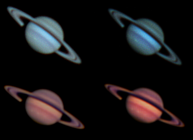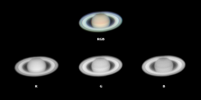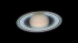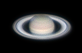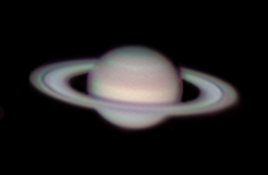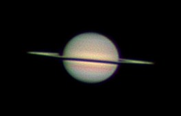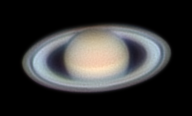 Note: First attempt of compositing Luminance and Chrominance from two different cameras. This is as perpendicular as the rings can be seen until 2038. Telescope: Celestron CPC 800 (8") Barlow: Orion 2x Shorty Plus Camera: DMK 21AU04 (Luminance) and Celestron NexImage (Chrominance) Exposure: Stack of 400 x 1/5 s @ 5 fps Overlaid in Photoshop Apparent Magnitude: 0.96 Distance: 8.9944 AU Date: 1st Jan 2009 Time: 5:09 am Site: Irving, TX |